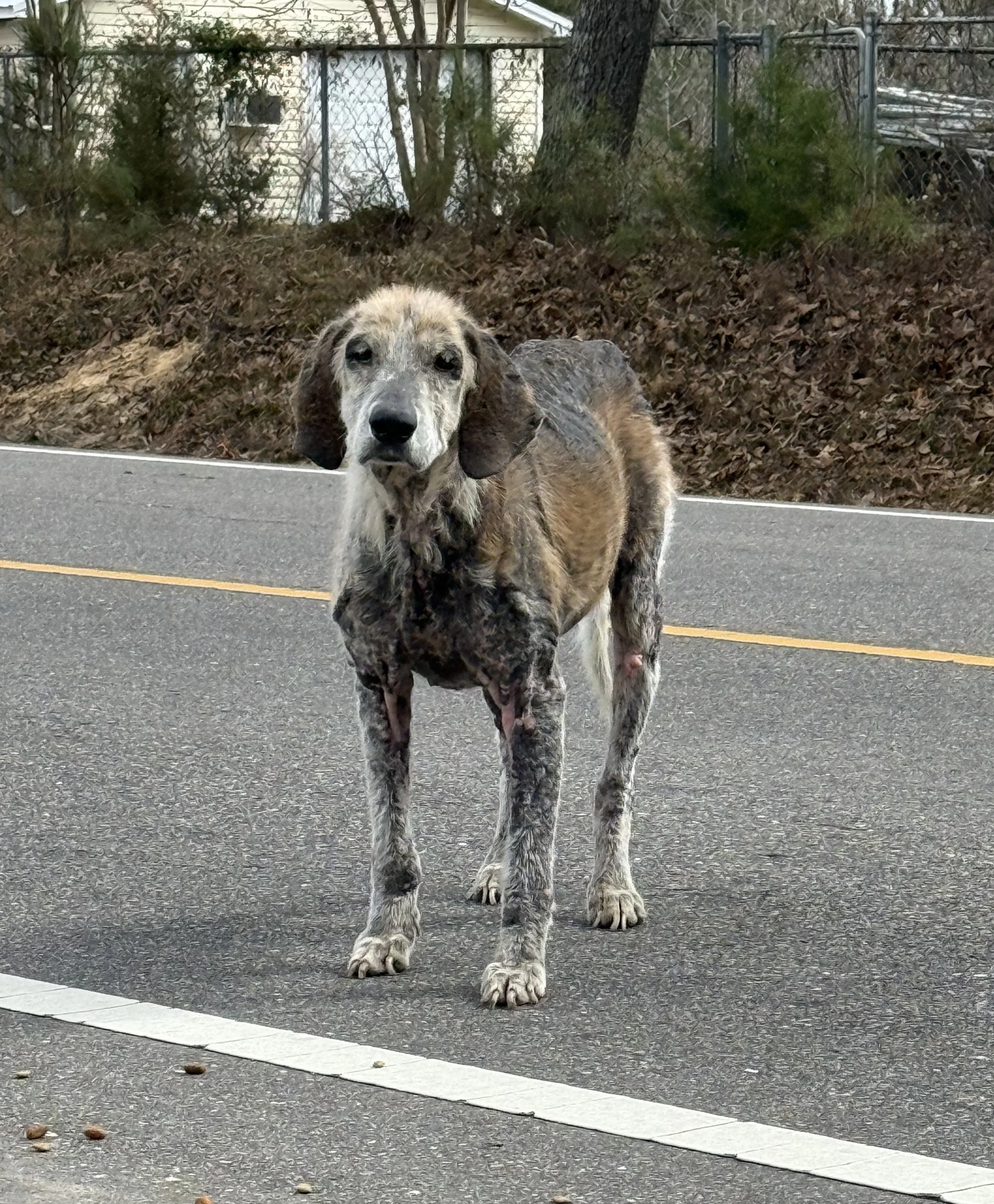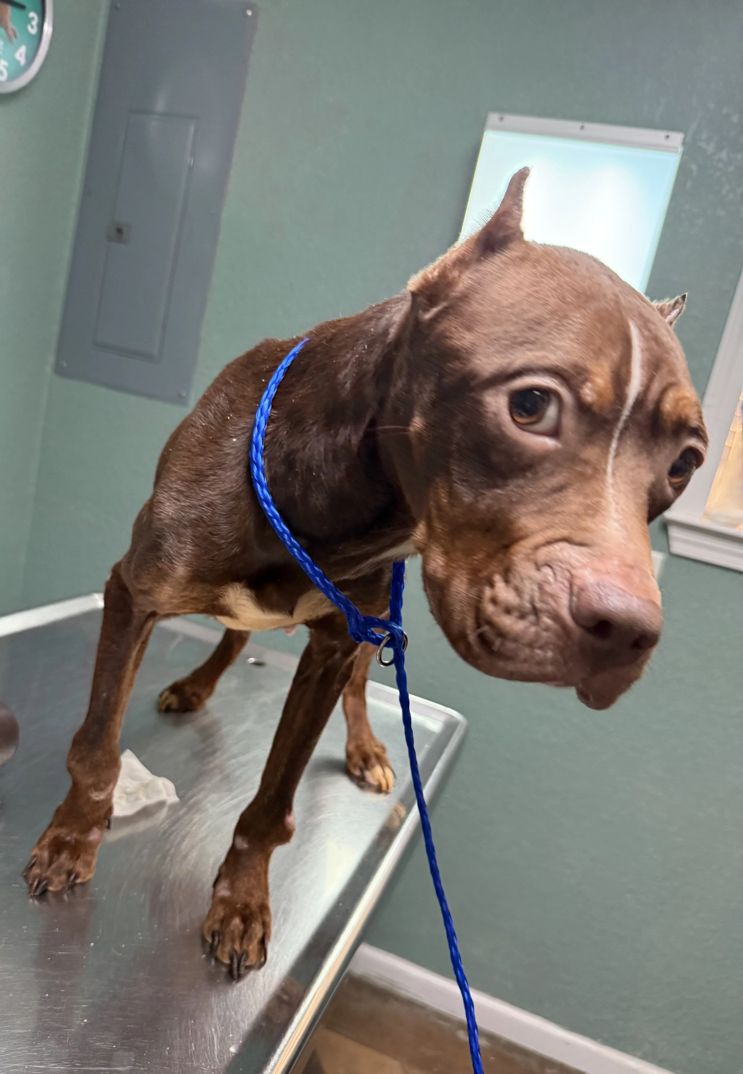 Starved. Fragile. Covered in scars. The kind of wounds that suggest a past we wish wasn’t real… possibly used as a bait dog.